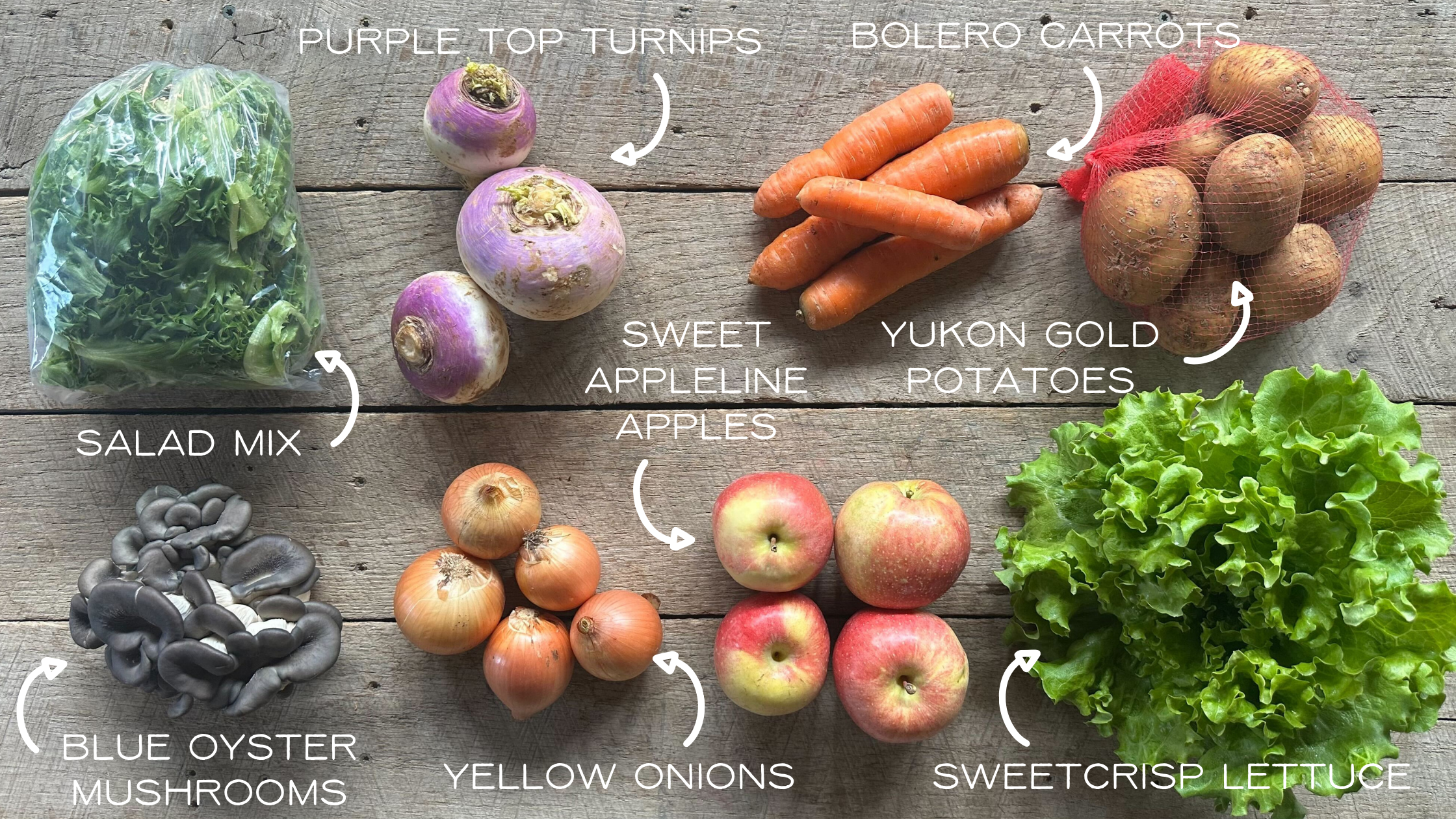 Yukon Gold Potatoes | Salad Mix | Bolero Carrots | Sweet Appleline OR Fuji Apples | Yellow Onions | Purple Top Turnip | Sweetcrisp Lettuce | Blue Oyster Mushrooms
