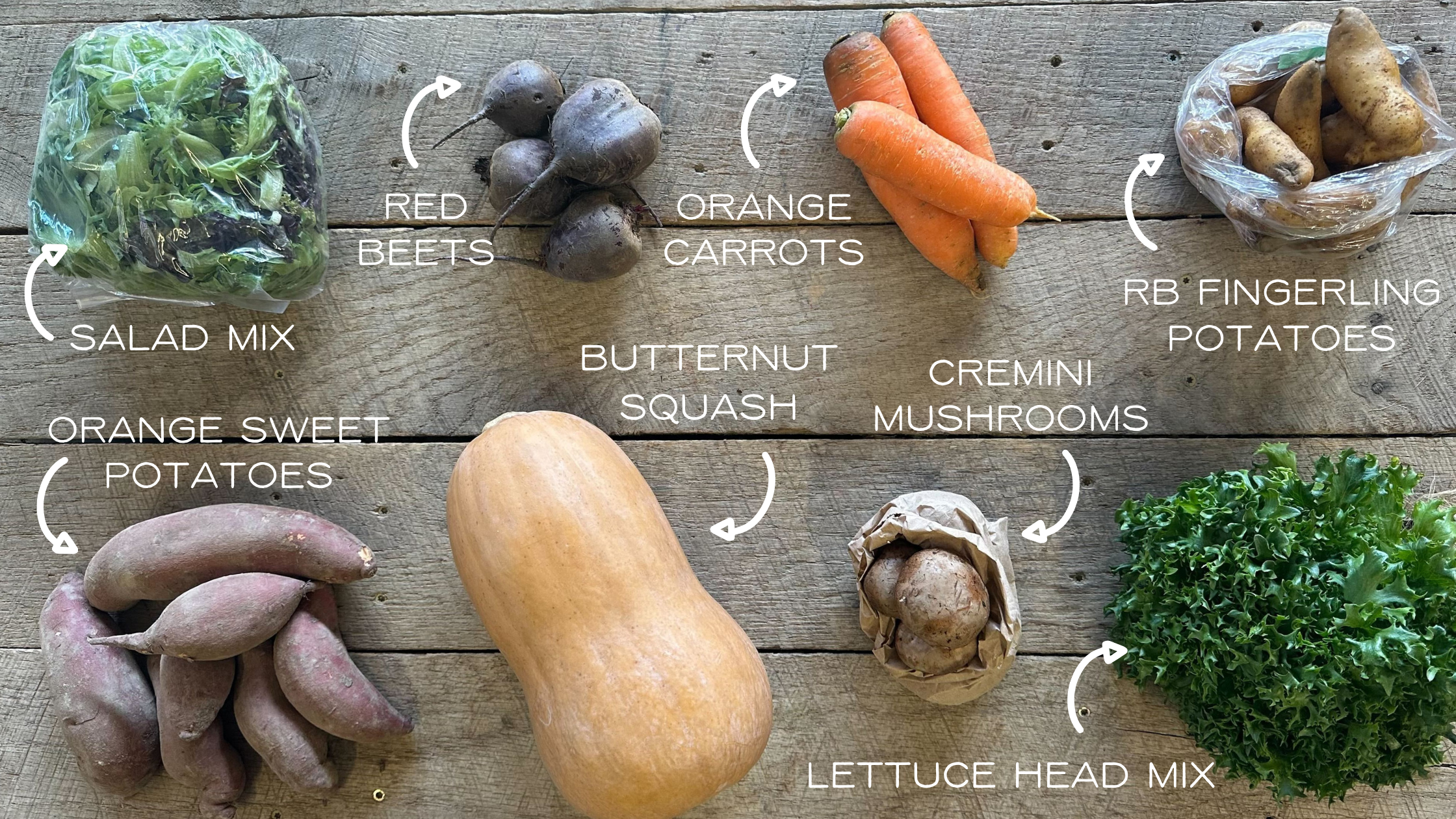 Cremini Mushrooms | Salad Mix | Orange Carrots | Red Beets | Orange Sweet Potatoes | Butternut Squash | Lettuce Head Mix | RB Fingerling Potatoes