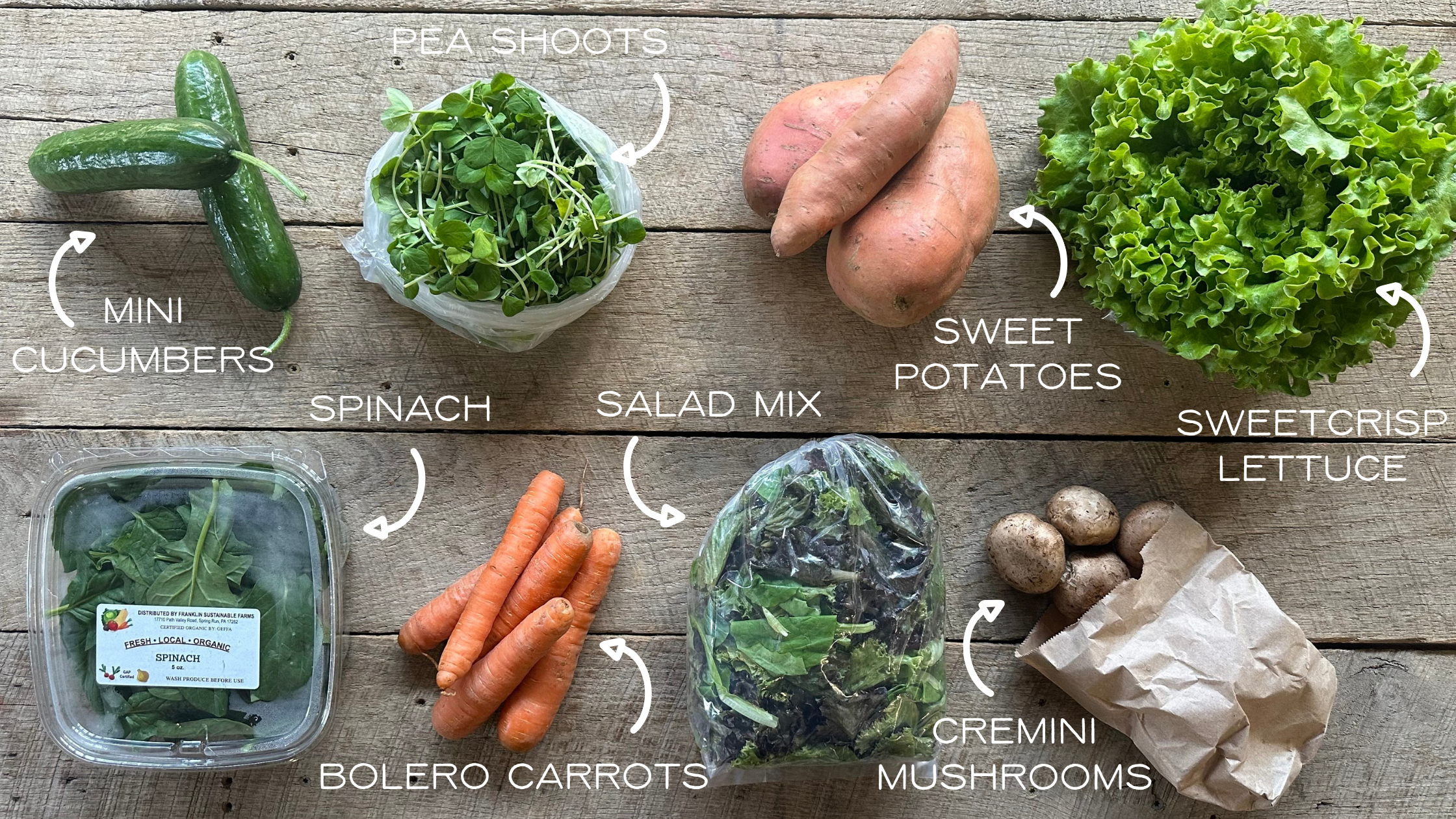 Spinach | Salad Mix | Bolero Carrots | Mini Cucumbers | Cremini Mushrooms | Sweet Potatoes | Sweetcrisp Lettuce | Pea Shoots