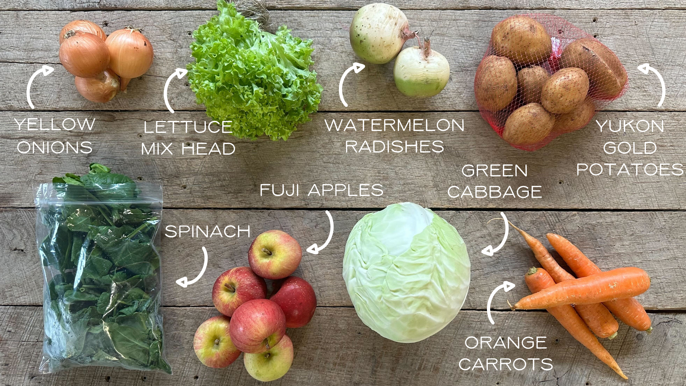 Yukon Gold Potatoes | Salad Mix *OR* Watermelon Radishes | Orange Carrots | Yellow Onions | Spinach | Green Cabbage | Lettuce Head Mix | Fuji Apples