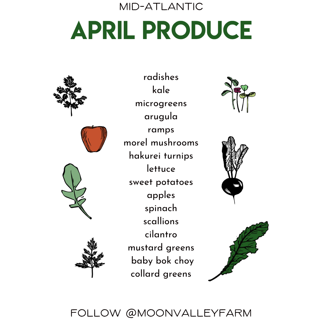 In season this month: greens, fresh herbs, and early spring favorites like radishes, ramps, and morel mushrooms. Sweet potatoes and apples are still holding strong! Click below to find recipes for everything in season this month below!