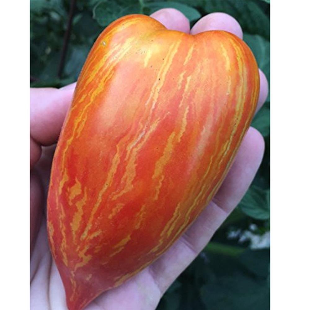 These beautiful elongated plum tomatoes have bright red skin and golden streaks. They’re good for fresh eating and also cooking quickly into sauce.